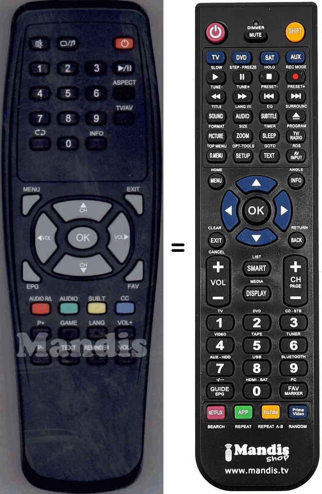 Fernbedienung, die das Original und die Gesamtheit seiner Funktionen, vollständig ersetzt. Es handelt sich jedoch nicht um eine Universalfernbedienung sondern um eine Fernbedienung die das Original ersetzt. Sie erhalten eine nach Einlegen der Batterien sofort einsatzbereite Fernbedienung. Jegliches Programmieren entfällt. Wir geben umfassende Garantie dafür, dass diese Fernbedienung alle Funktionen der Originalfernbedienung erfüllt.