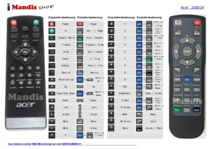 Diese Fernbedienung erfüllt alle Funktionen der Originalfernbedienung: Power, e, Aspect Ratio, Freeze, Hide, Zoom, Resync, Source, Up / Keystone+, Down / Keystone-, Left, Menu, Right, 1, 2, 3, Vol UP, Vol DN, 0 / Mute, 4 / VGA, 5 / Component, 6 / Video, 7 / S-Video, 8 / HDMI, 9 / Wireless