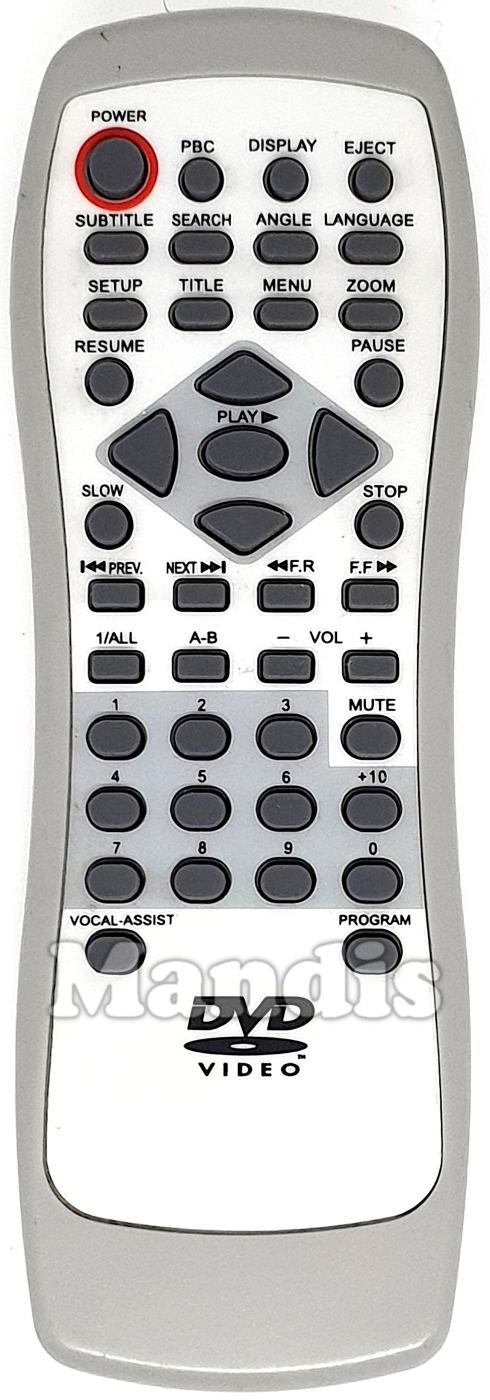 Power / Stand By, PBC, Display, Eject, Subtitle, Search, Angle, Language, Setup, Title, Menu, Zoom, Resume, Pause, Up, Left, Play, Right, Down, Slow, Stop, I<< Prev., Next >>I, << F.R, F.F >>, 1/All, A-B, Vol-, Vol+, Mute, 1, 2, 3, 4, 5, 6, 7, 8, 9, 0, +10, Vocal-Assist, Program