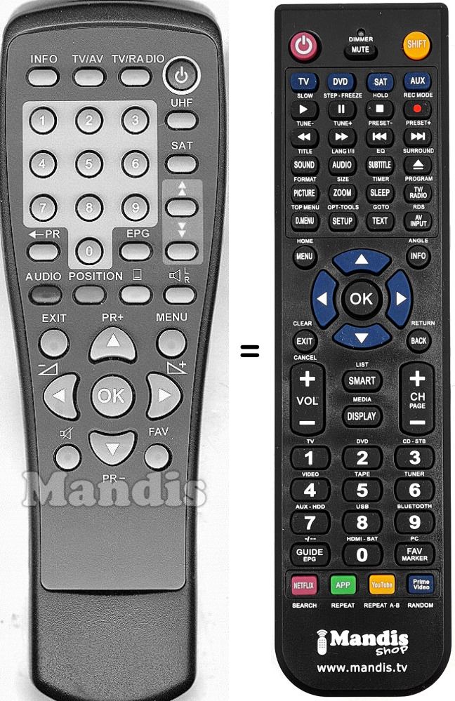 Fernbedienung, die das Original und die Gesamtheit seiner Funktionen, vollständig ersetzt. Es handelt sich jedoch nicht um eine Universalfernbedienung sondern um eine Fernbedienung die das Original ersetzt. Sie erhalten eine nach Einlegen der Batterien sofort einsatzbereite Fernbedienung. Jegliches Programmieren entfällt. Wir geben umfassende Garantie dafür, dass diese Fernbedienung alle Funktionen der Originalfernbedienung erfüllt.
