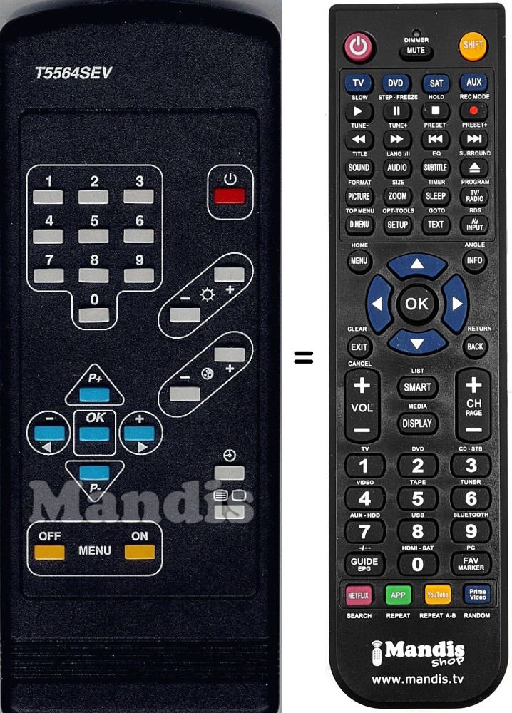 Die Fernbedienung ersetzt das Original T5564EV in der Gesamtheit seiner Funktionen.
