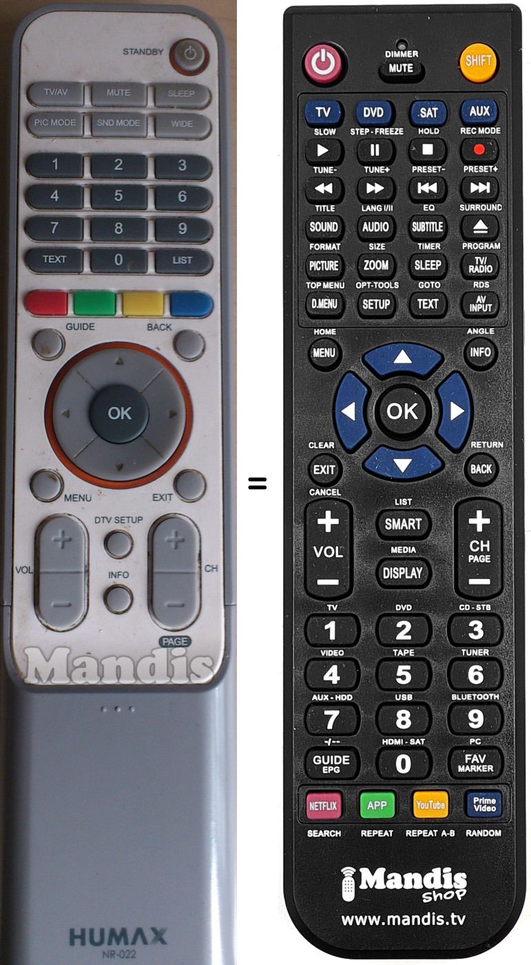 Die Fernbedienung ersetzt das Original NR022 in der Gesamtheit seiner Funktionen.