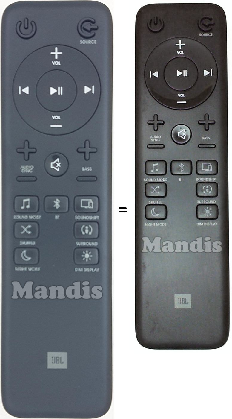 Diese Fernbedienung verfügt über folgende Tasten: Power, Source, Vol +, Vol -, >I, I<, Play / Pause, Audio Sync +, Audio Sync -, Mute, Bass +, Bass -, Sound Mode, BT, Sound Shift, Shuffle, Surround, Night Mode, DIM Display