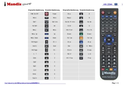 Ein Dokument ist enthalten, um die Verwendung der neuen Fernbedienung zu erleichtern, indem es die Tastenbelegung zeigt.