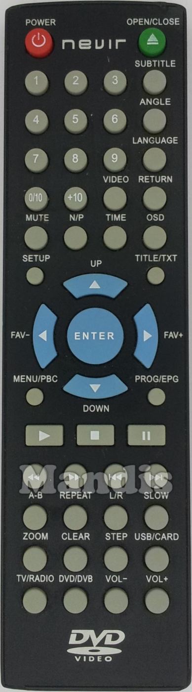 Power, Open/Close, Subtitle, Angle, Language, Return, OSD, Video, Time, N/P, Mute, Setup, Title/TXT, Up, Down, Left/FAV-, Right/FAV+, Enter, Menu/PBC, Prog/EPG, Play, Stop, Pause, 1, 2, 3, 4, 5, 6, 7, 8, 9, 0/10, +10, <<, >>, I<<, >>I, A-B, Repeat, L/R, Slow, Zoom, Clear, Step, USB/Card, Tv/Radio, DVD/DVB, Vol-, Vol+
