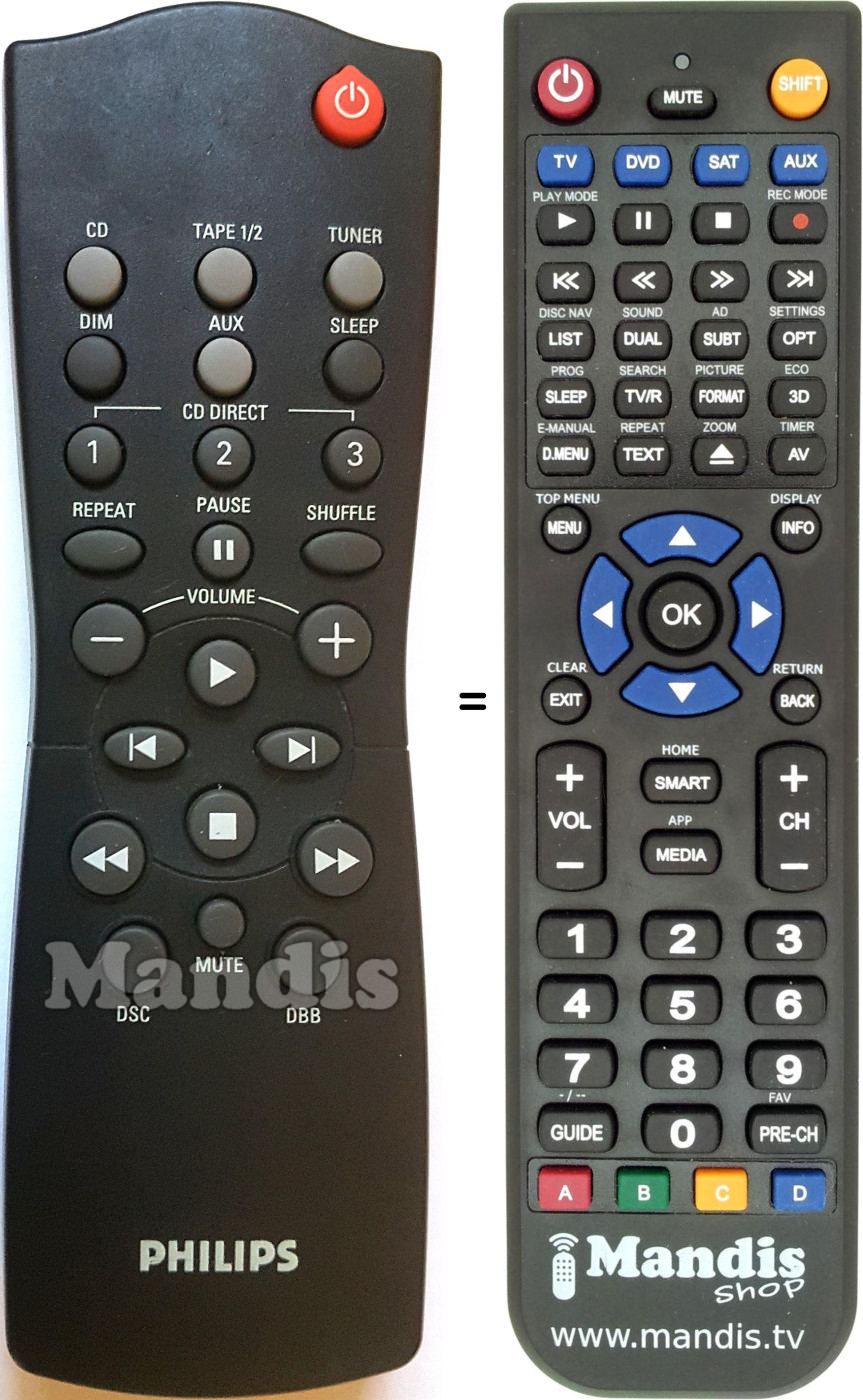 Diese Fernbedienung erfüllt alle Funktionen der Originalfernbedienung: Power, DIM, Sleep, CD Direct 1, CD Direct 2, CD Direct 3, Pause, Repeat, Shuffle, Vol-, Vol+, Play, I<, >I, Stop, <<, >>, DSC, DBB, Mute