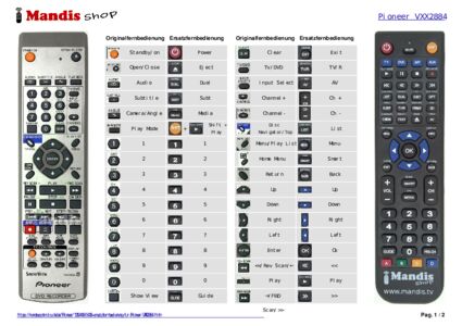 Im Folgenden zeigen wir Ihnen die Zuordnung jedes einzelnen Knopfes der Originalfernbedienung zu der Taste, die dieselbe Funktion auf der Ersatzfernbedienung ausführt. In einigen Fällen müssen Sie möglicherweise die UMSCHALT-Taste drücken, bevor Sie eine andere Taste drücken, um bestimmte Aktionen auszuführen. Diese zusätzlichen Funktionen werden oft wenig genutzt und dienen dazu, das Verständnis der Ersatzfernbedienung zu erleichtern oder weil die Originalfernbedienung mehr Tasten hat als das entsprechende Modell.