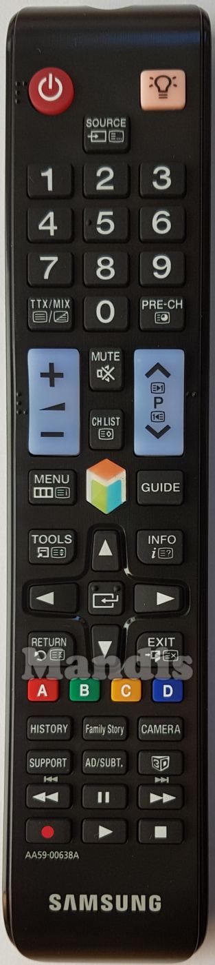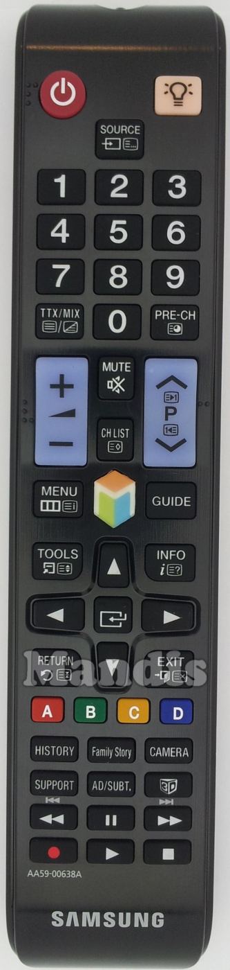 STANDBY, SOURCE, 1, 2, 3, 4, 5, 6, 7, 8, 9, 0, TTX/MIX, PRE-CH, VOL+, VOL-, PR+, PR-, MUTE, CH LIST, MENU, GUIDE, TOOLS, INFO, RETURN, EXIT, ENTER, UP, DOWN, RIGHT, LEFT, RED, GREEN, YELLOW, BLUE, HISTORY, FAMILY STORY, CAMERA, SUPPORT, AD/SUBT, 3D, <<, PAUSE, >>, REC, PLAY, STOP, Smart Hub