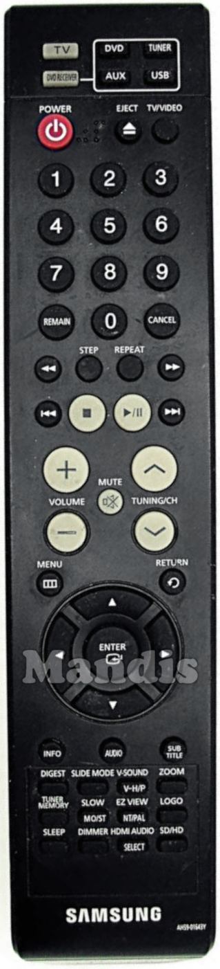 TV, DVD Receiver, DVD, Tuner, AUX, USB, Power, Eject, TV / Video, 1, 2, 3, 4, 5, 6, 7, 8, 9, 0, Remain, Cancel, <<, Step, Repeat, >>, I<<, Stop, Play / Pause, >>I, Volume +, Volume -, Mute, Tuning/CH +, Tuning/CH -, Menu, Return, Up, Left, Enter, Right, Down, Info, Audio, SubTitle, Digest, Slide Mode, V-H/P / V-Sound, Zoom, Tuner Memory, MO/ST / Slow, NT/PAL / EZ View, Logo, Sleep, Dimmer, HDMI Audio Select, SD/HD