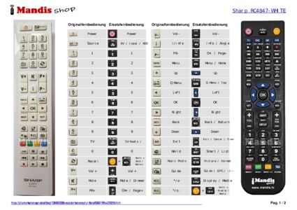 Im Folgenden zeigen wir Ihnen die Zuordnung jedes einzelnen Knopfes der Originalfernbedienung zu der Taste, die dieselbe Funktion auf der Ersatzfernbedienung ausführt. In einigen Fällen müssen Sie möglicherweise die UMSCHALT-Taste drücken, bevor Sie eine andere Taste drücken, um bestimmte Aktionen auszuführen. Diese zusätzlichen Funktionen werden oft wenig genutzt und dienen dazu, das Verständnis der Ersatzfernbedienung zu erleichtern oder weil die Originalfernbedienung mehr Tasten hat als das entsprechende Modell.