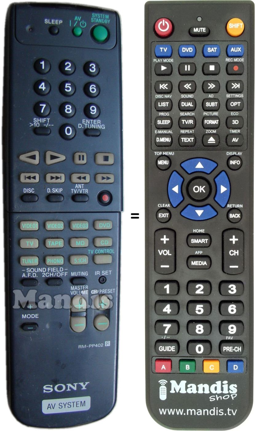 Diese Fernbedienung ersetzt die meisten Funktionen Ihres RM-PP402. Es ist keine Universalfernbedienung, sondern eine Kopie mit den meisten Tasten und Funktionen Ihres Originals.