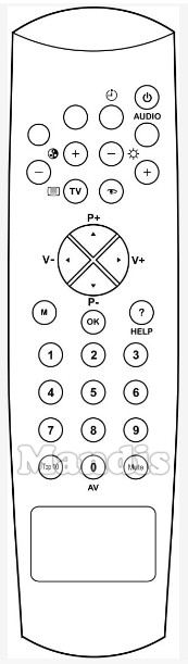 Power, Red/Audio, Green/Timer, Yellow, Blue, Colour-, Brightness-, Colour+, Brightness+, Display, TV, Up/P+, Down/P-, Right/V+, Left/V-, Menu, OK, Help/?, 1, 2, 3, 4, 5, 6, 7, 8, 9, 0/AV, Mute, Top 10