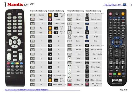Im Folgenden zeigen wir Ihnen die Zuordnung jedes einzelnen Knopfes der Originalfernbedienung zu der Taste, die dieselbe Funktion auf der Ersatzfernbedienung ausführt. In einigen Fällen müssen Sie möglicherweise die UMSCHALT-Taste drücken, bevor Sie eine andere Taste drücken, um bestimmte Aktionen auszuführen. Diese zusätzlichen Funktionen werden oft wenig genutzt und dienen dazu, das Verständnis der Ersatzfernbedienung zu erleichtern oder weil die Originalfernbedienung mehr Tasten hat als das entsprechende Modell.