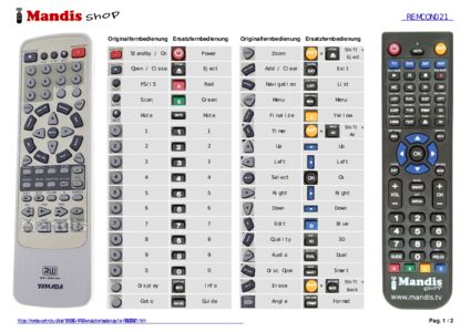 Im Folgenden zeigen wir Ihnen die Zuordnung jedes einzelnen Knopfes der Originalfernbedienung zu der Taste, die dieselbe Funktion auf der Ersatzfernbedienung ausführt. In einigen Fällen müssen Sie möglicherweise die UMSCHALT-Taste drücken, bevor Sie eine andere Taste drücken, um bestimmte Aktionen auszuführen. Diese zusätzlichen Funktionen werden oft wenig genutzt und dienen dazu, das Verständnis der Ersatzfernbedienung zu erleichtern oder weil die Originalfernbedienung mehr Tasten hat als das entsprechende Modell.