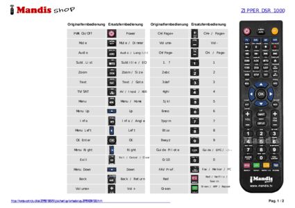 Ein Dokument ist enthalten, um die Verwendung der neuen Fernbedienung zu erleichtern, indem es die Tastenbelegung zeigt.