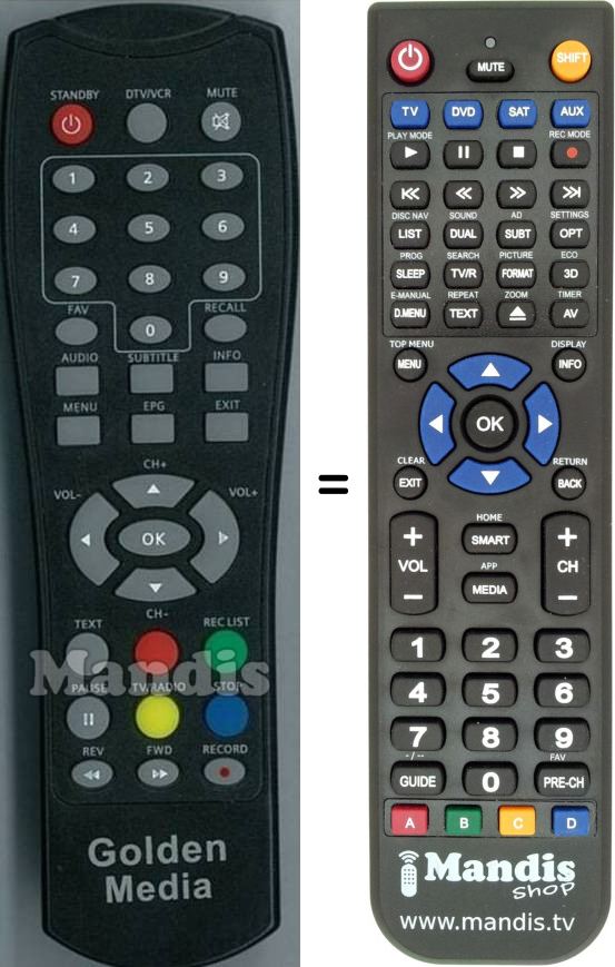 This remote control fully replaces your Goldenmedia and offers all the functions of the original.