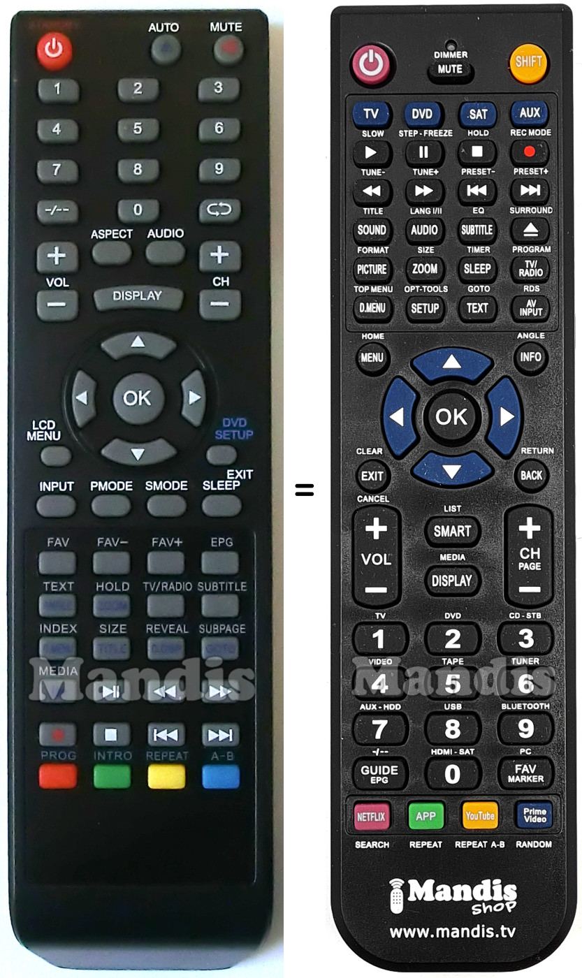 Below, we will show you the correspondence between each button on the original remote control and the button that performs the same function on the replacement remote control. In some cases, you may need to press the SHIFT key before pressing another button to perform certain actions. These additional functions are often not widely used and are included to facilitate understanding of the replacement remote control, or because the original remote control has more buttons than its equivalent.