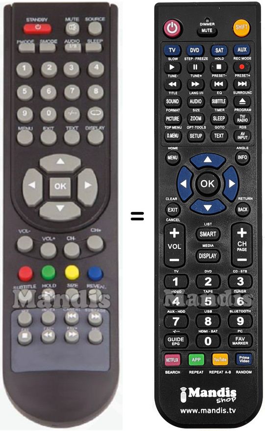 Below, we will show you the correspondence between each button on the original remote control and the button that performs the same function on the replacement remote control. In some cases, you may need to press the SHIFT key before pressing another button to perform certain actions. These additional functions are often not widely used and are included to facilitate understanding of the replacement remote control, or because the original remote control has more buttons than its equivalent.
