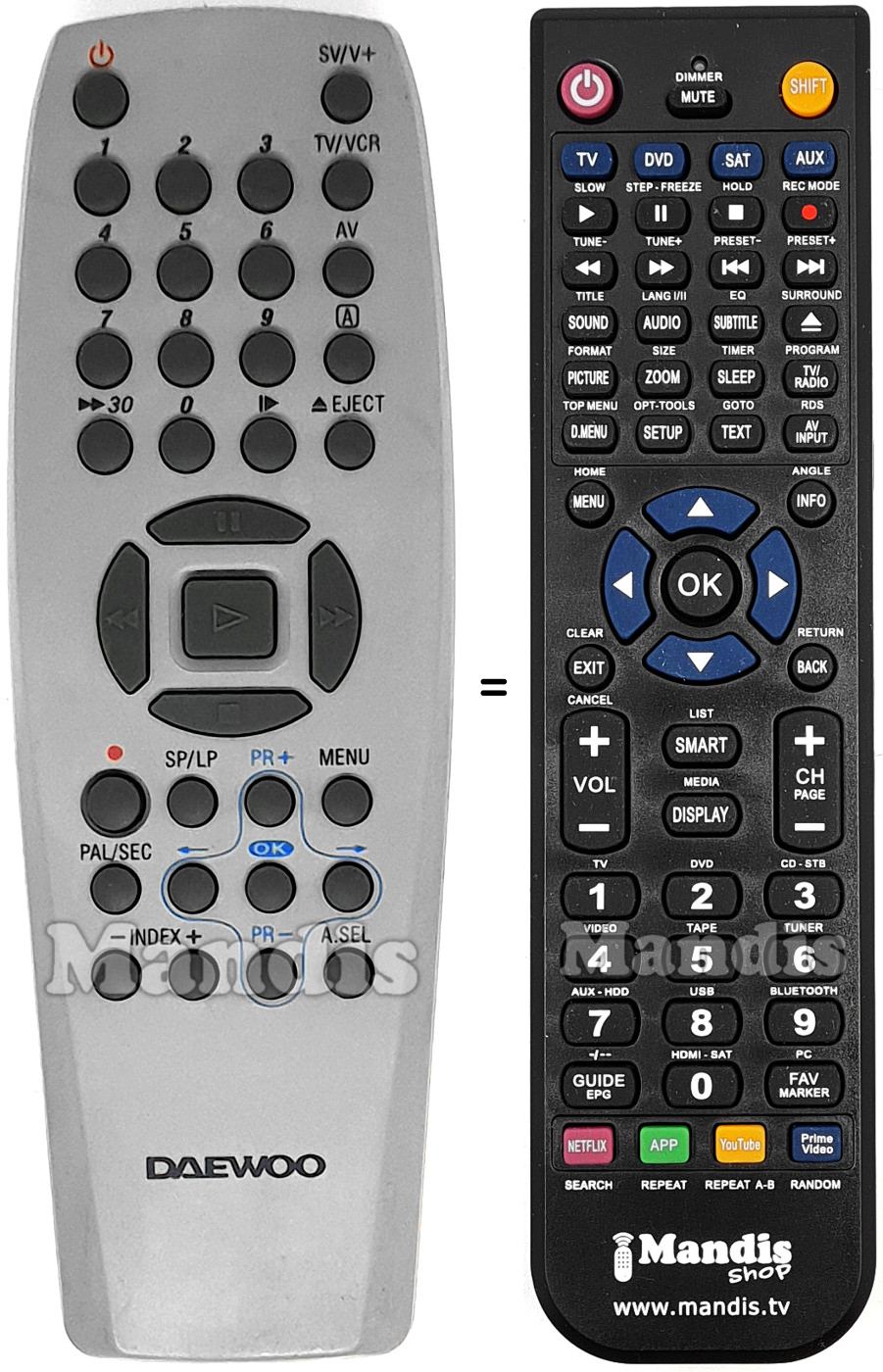Below, we will show you the correspondence between each button on the original remote control and the button that performs the same function on the replacement remote control. In some cases, you may need to press the SHIFT key before pressing another button to perform certain actions. These additional functions are often not widely used and are included to facilitate understanding of the replacement remote control, or because the original remote control has more buttons than its equivalent.