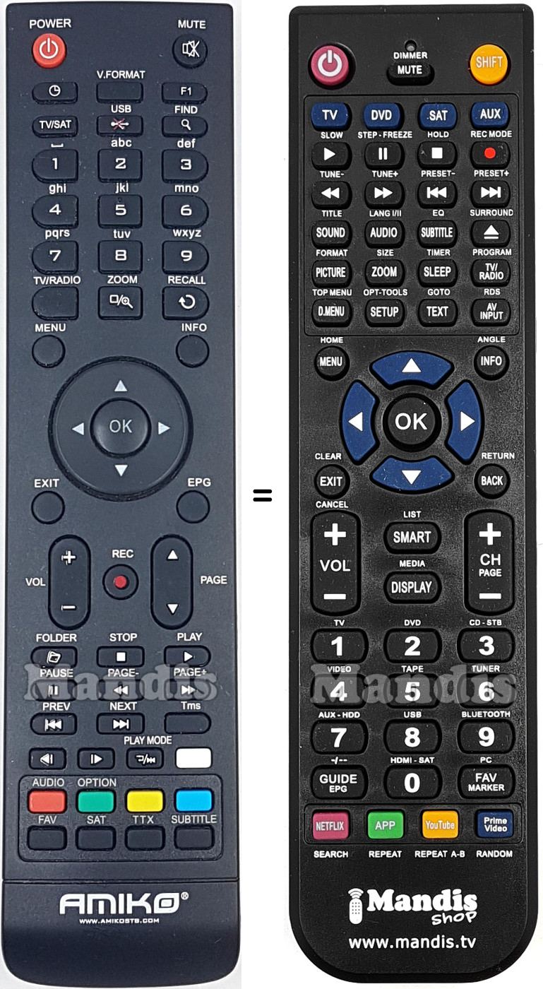 Below, we will show you the correspondence between each button on the original remote control and the button that performs the same function on the replacement remote control. In some cases, you may need to press the SHIFT key before pressing another button to perform certain actions. These additional functions are often not widely used and are included to facilitate understanding of the replacement remote control, or because the original remote control has more buttons than its equivalent.