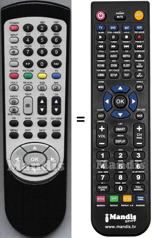Below, we will show you the correspondence between each button on the original remote control and the button that performs the same function on the replacement remote control. In some cases, you may need to press the SHIFT key before pressing another button to perform certain actions. These additional functions are often not widely used and are included to facilitate understanding of the replacement remote control, or because the original remote control has more buttons than its equivalent.