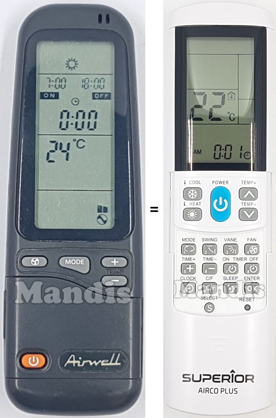 My LG air-conditioner's remote died and need replacement. AircoPlus did the job. I should point out that the code match did not correspond according to manufacturer's table. Let the auto-search code set up do the work. Also, excellent service by Mandis Remotes with a well-protected package.