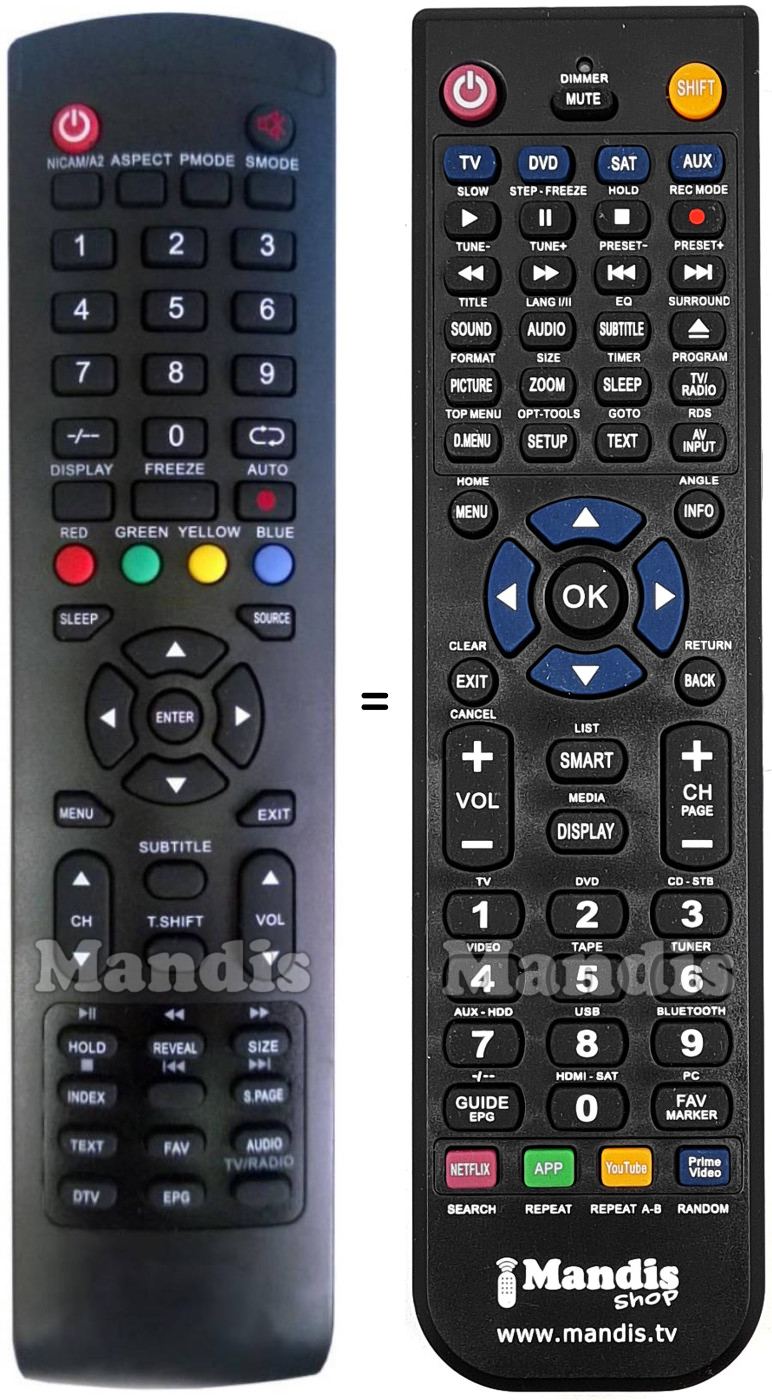 Below, we will show you the correspondence between each button on the original remote control and the button that performs the same function on the replacement remote control. In some cases, you may need to press the SHIFT key before pressing another button to perform certain actions. These additional functions are often not widely used and are included to facilitate understanding of the replacement remote control, or because the original remote control has more buttons than its equivalent.