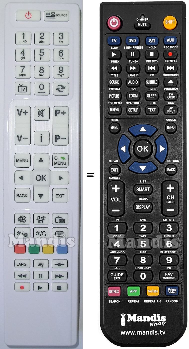 Below, we will show you the correspondence between each button on the original remote control and the button that performs the same function on the replacement remote control. In some cases, you may need to press the SHIFT key before pressing another button to perform certain actions. These additional functions are often not widely used and are included to facilitate understanding of the replacement remote control, or because the original remote control has more buttons than its equivalent.