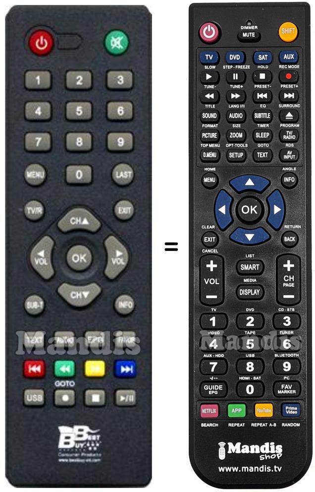 Below, we will show you the correspondence between each button on the original remote control and the button that performs the same function on the replacement remote control. In some cases, you may need to press the SHIFT key before pressing another button to perform certain actions. These additional functions are often not widely used and are included to facilitate understanding of the replacement remote control, or because the original remote control has more buttons than its equivalent.