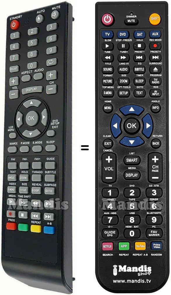 Below, we will show you the correspondence between each button on the original remote control and the button that performs the same function on the replacement remote control. In some cases, you may need to press the SHIFT key before pressing another button to perform certain actions. These additional functions are often not widely used and are included to facilitate understanding of the replacement remote control, or because the original remote control has more buttons than its equivalent.