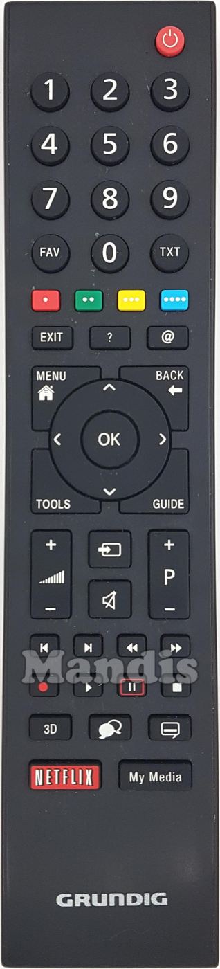 Power, 1, 2, 3, 4, 5, 6, 7, 8, 9, 0, FAV, TXT, Red, Green, Yellow, Blue, Exit, ?, @, Menu, Back, Guide, Tools, Up, Down, Right, Left, OK, Source, Mute, Vol+, Vol-, P+, P-, I<, >I, <<, >>, Rec, Play, Pause, Stop, 3D, ..OQ, [...].., Netflix, My Media
