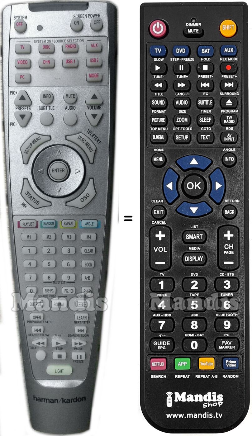 Below, we will show you the correspondence between each button on the original remote control and the button that performs the same function on the replacement remote control. In some cases, you may need to press the SHIFT key before pressing another button to perform certain actions. These additional functions are often not widely used and are included to facilitate understanding of the replacement remote control, or because the original remote control has more buttons than its equivalent.