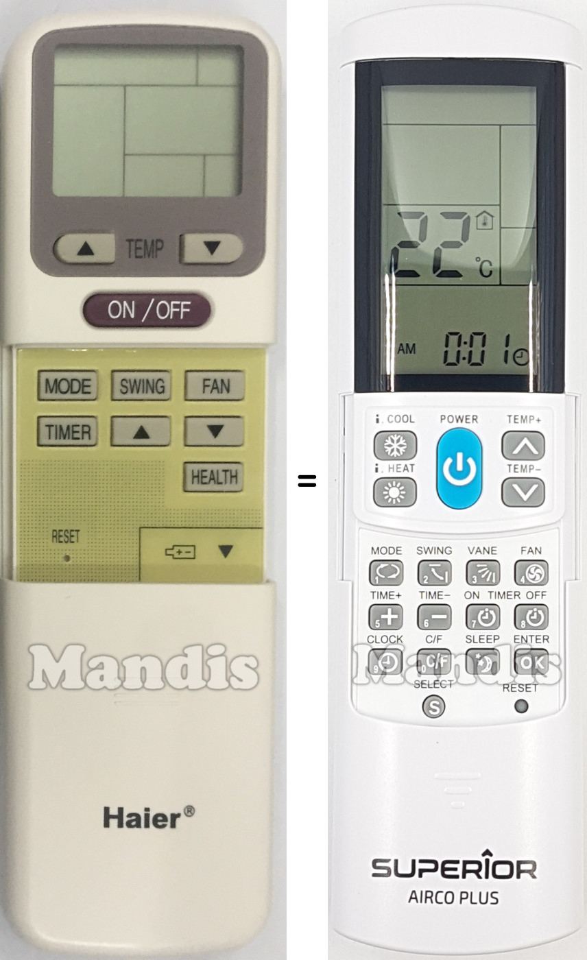My LG air-conditioner's remote died and need replacement. AircoPlus did the job. I should point out that the code match did not correspond according to manufacturer's table. Let the auto-search code set up do the work. Also, excellent service by Mandis Remotes with a well-protected package.