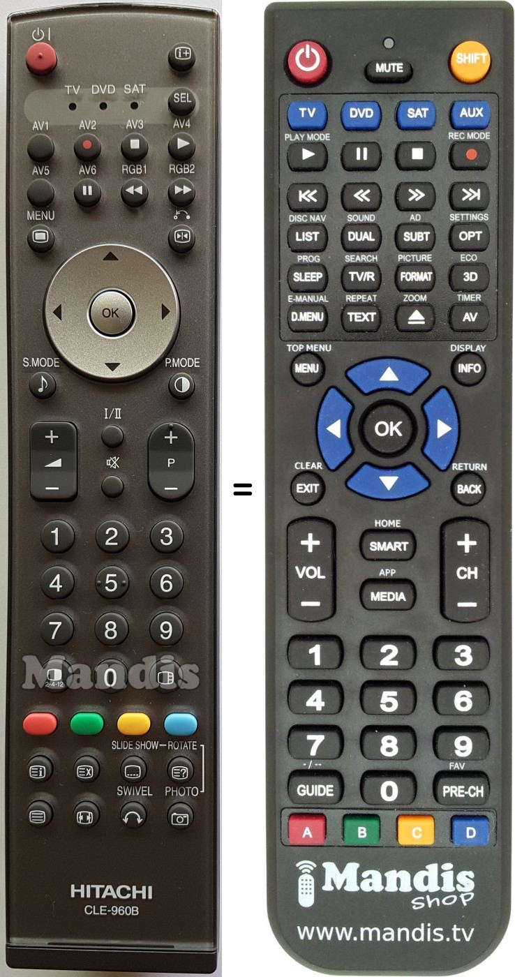Below, we will show you the correspondence between each button on the original remote control and the button that performs the same function on the replacement remote control. In some cases, you may need to press the SHIFT key before pressing another button to perform certain actions. These additional functions are often not widely used and are included to facilitate understanding of the replacement remote control, or because the original remote control has more buttons than its equivalent.