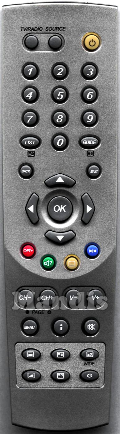 Power, TV/Radio, Source, 1, 2, 3, 4, 5, 6, 7, 8, 9, 0, List / [≡◕], Guide / [≡⧗], Back, Exit, Up, Left, OK, Right, Down, Red / OPT+, Green / Audio, Yellow / Subtitle, Blue / ▶|◀, CH- / Page-, CH+ / Page+, V-, V+, Menu, i, Mute, [≡], [≡↕], [≡X] / Wide, [ /≡], [≡?], G