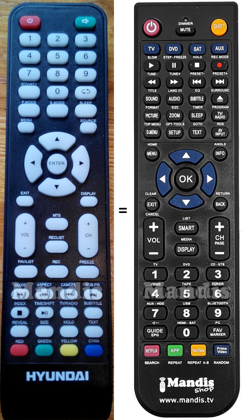 Below, we will show you the correspondence between each button on the original remote control and the button that performs the same function on the replacement remote control. In some cases, you may need to press the SHIFT key before pressing another button to perform certain actions. These additional functions are often not widely used and are included to facilitate understanding of the replacement remote control, or because the original remote control has more buttons than its equivalent.
