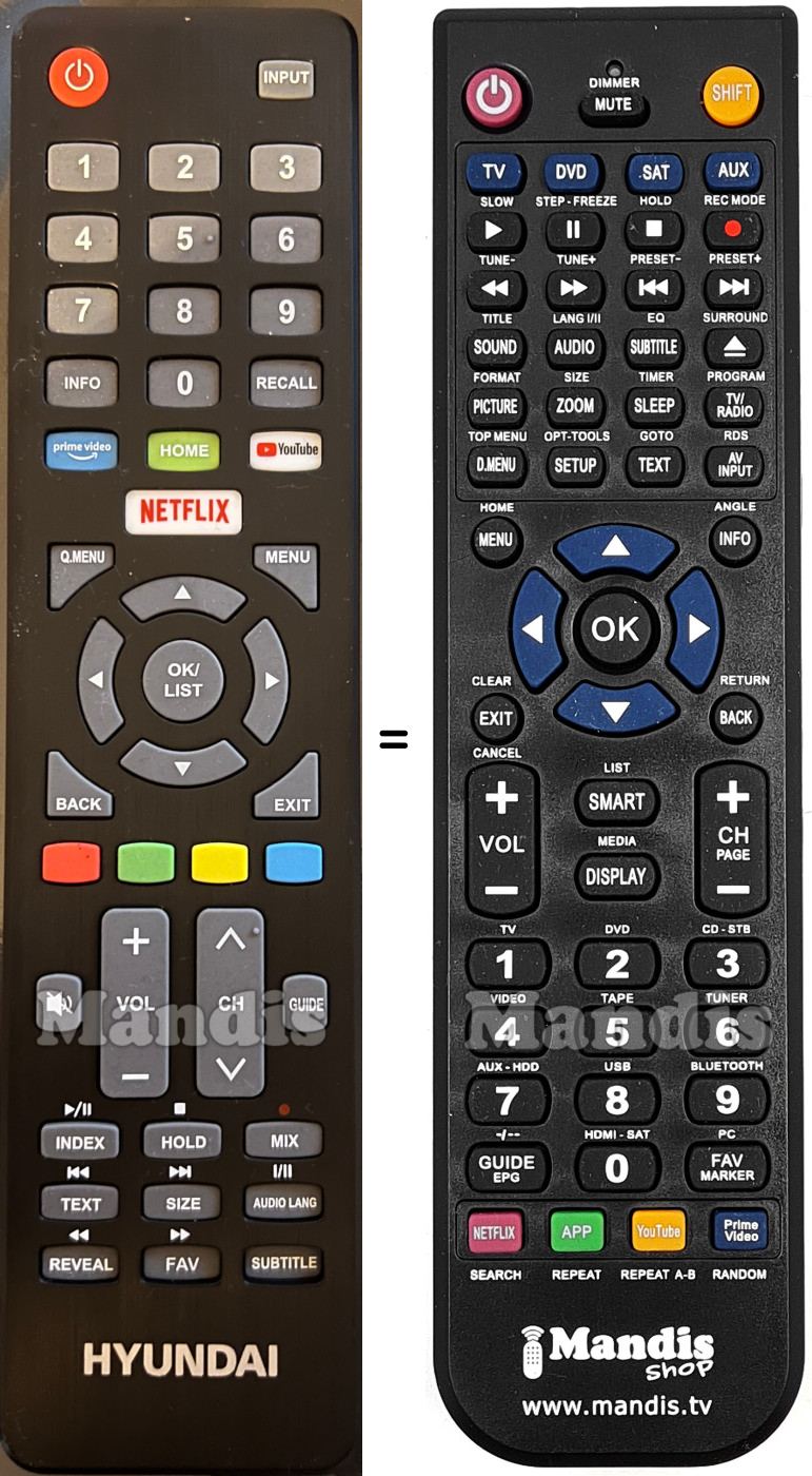 Below, we will show you the correspondence between each button on the original remote control and the button that performs the same function on the replacement remote control. In some cases, you may need to press the SHIFT key before pressing another button to perform certain actions. These additional functions are often not widely used and are included to facilitate understanding of the replacement remote control, or because the original remote control has more buttons than its equivalent.