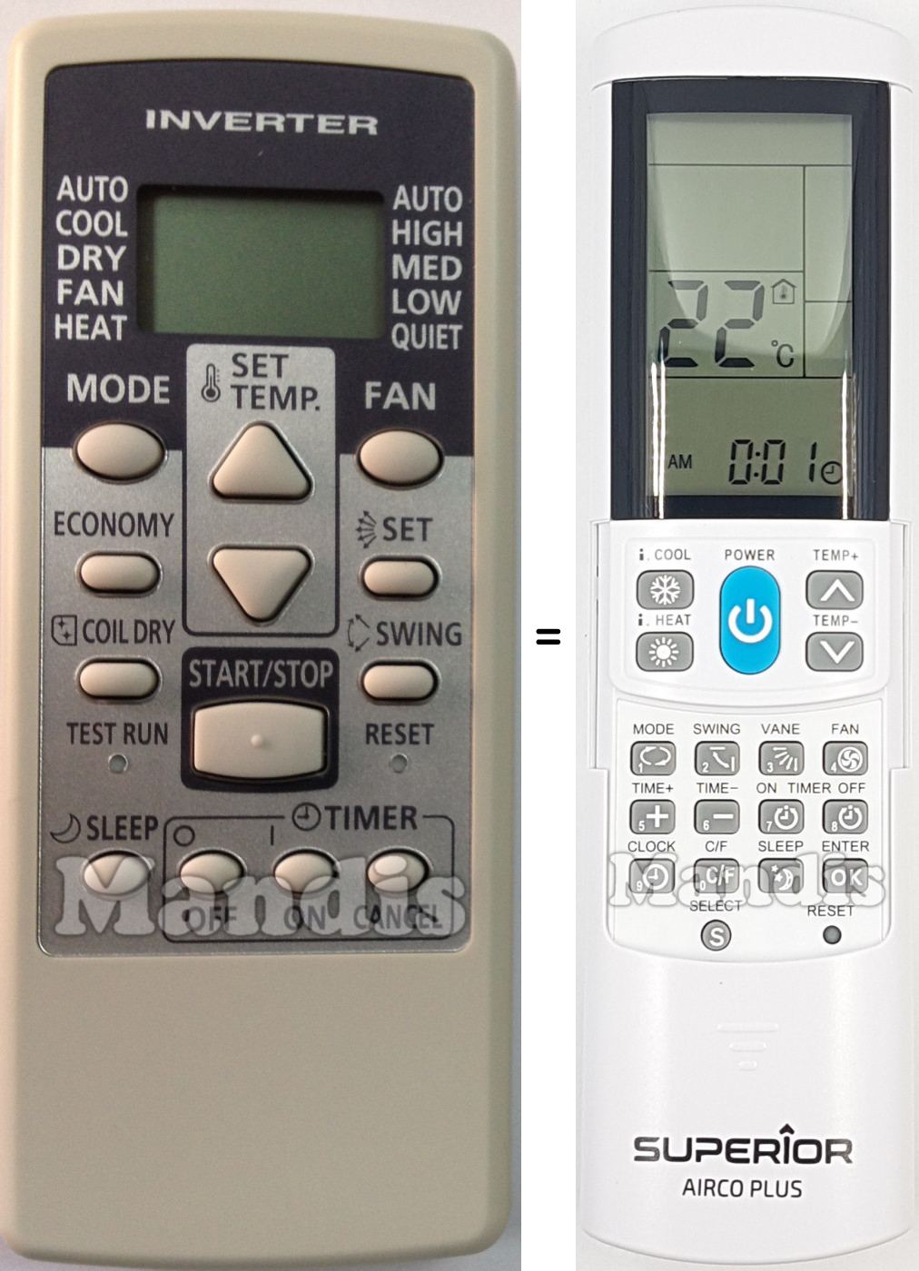 My LG air-conditioner's remote died and need replacement. AircoPlus did the job. I should point out that the code match did not correspond according to manufacturer's table. Let the auto-search code set up do the work. Also, excellent service by Mandis Remotes with a well-protected package.