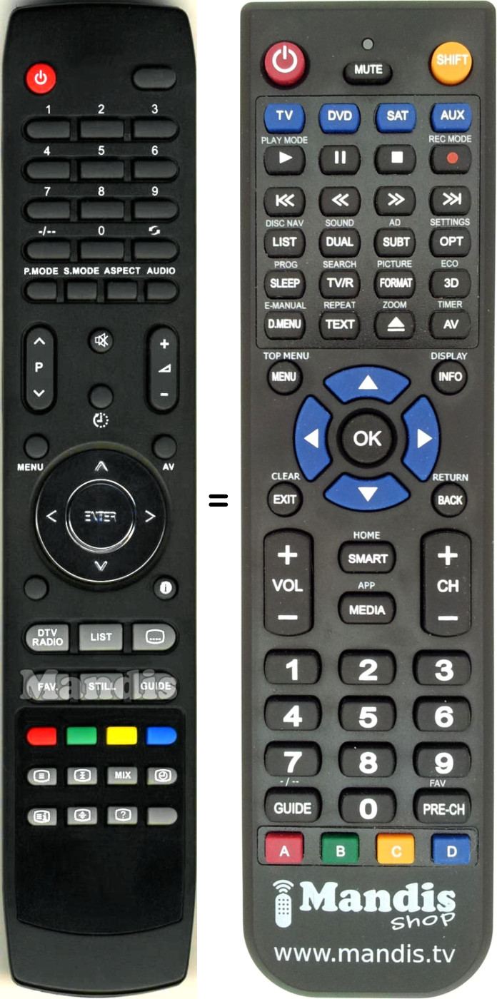 Below, we will show you the correspondence between each button on the original remote control and the button that performs the same function on the replacement remote control. In some cases, you may need to press the SHIFT key before pressing another button to perform certain actions. These additional functions are often not widely used and are included to facilitate understanding of the replacement remote control, or because the original remote control has more buttons than its equivalent.