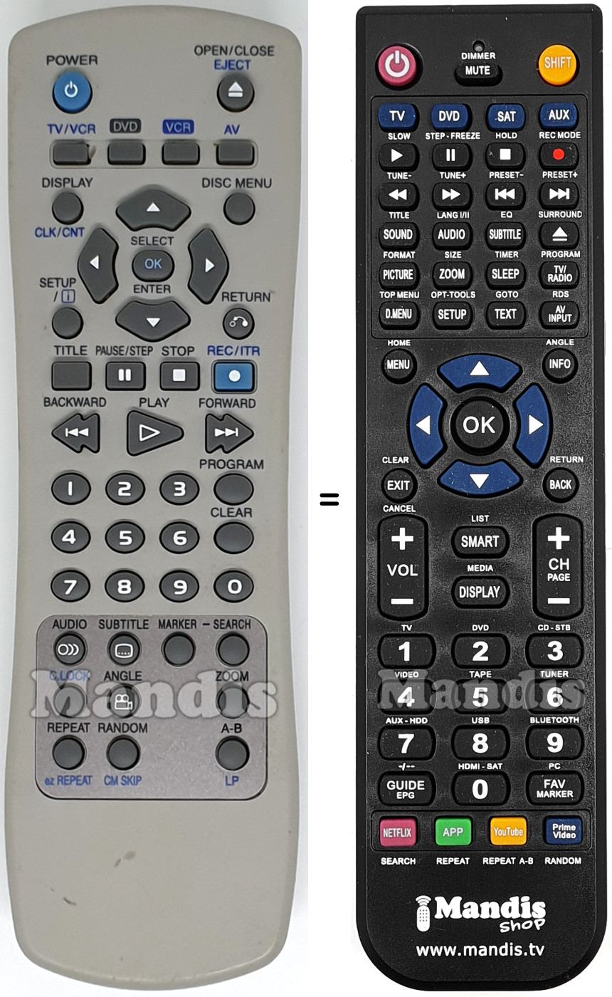 Below, we will show you the correspondence between each button on the original remote control and the button that performs the same function on the replacement remote control. In some cases, you may need to press the SHIFT key before pressing another button to perform certain actions. These additional functions are often not widely used and are included to facilitate understanding of the replacement remote control, or because the original remote control has more buttons than its equivalent.