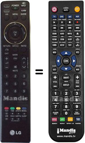 This remote control performs all the functions of the original remote control: TV, DVD, Power, Input, Alarm, I/II, Menu, Guide, Up, Left, Down, Right, OK, Return/Exit, Info, Ratio, Vol+, Vol-, FAV/Mark, Mute, Page+, Page-, 1, 2, 3, 4, 5, 6, 7, 8, 9, 0, List, Q.View, Red/Text, Green/Time, Yellow/Update, Blue/Reveal, USB, Stop/Hold, Play/Subtitle, Pause/Sleep, [=i], <<, >>