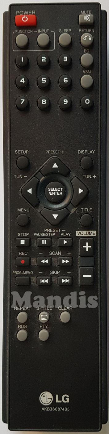 Power, Mute, Function, Input, Sleep, Return, EQ, VSM, 1, 2, 3, 4, 5, 6, 7, 8, 9, 0, Setup, Display, Menu, Title, Up/Preset+, Down/Preset-, Right/Tun.+, Left/Tun.-, Select/Enter, Stop, Pause/Step, Play, Rec, <</Scan-, >>/Scan+, I<</Skip-, >>I/Skip+, Prog.Memo, Vol+, Vol-, Repeat, S-Title, Clear, RDS, PTY