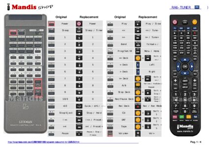 Below, we will show you the correspondence between each button on the original remote control and the button that performs the same function on the replacement remote control. In some cases, you may need to press the SHIFT key before pressing another button to perform certain actions. These additional functions are often not widely used and are included to facilitate understanding of the replacement remote control, or because the original remote control has more buttons than its equivalent.