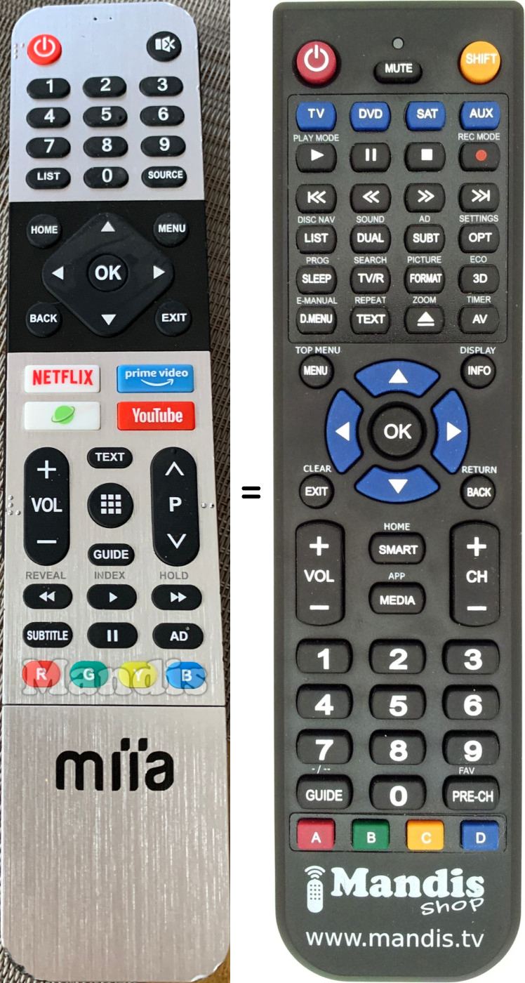 Below, we will show you the correspondence between each button on the original remote control and the button that performs the same function on the replacement remote control. In some cases, you may need to press the SHIFT key before pressing another button to perform certain actions. These additional functions are often not widely used and are included to facilitate understanding of the replacement remote control, or because the original remote control has more buttons than its equivalent.