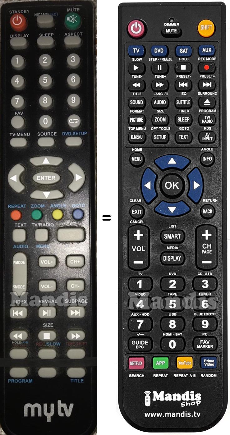 Below, we will show you the correspondence between each button on the original remote control and the button that performs the same function on the replacement remote control. In some cases, you may need to press the SHIFT key before pressing another button to perform certain actions. These additional functions are often not widely used and are included to facilitate understanding of the replacement remote control, or because the original remote control has more buttons than its equivalent.