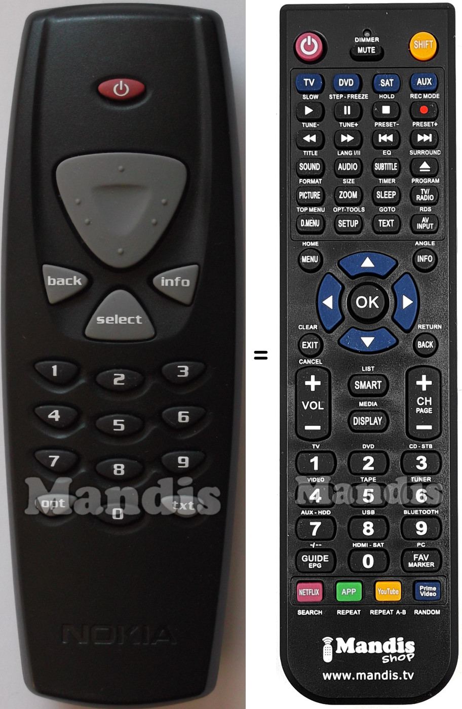 Below, we will show you the correspondence between each button on the original remote control and the button that performs the same function on the replacement remote control. In some cases, you may need to press the SHIFT key before pressing another button to perform certain actions. These additional functions are often not widely used and are included to facilitate understanding of the replacement remote control, or because the original remote control has more buttons than its equivalent.