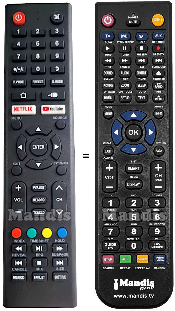 Below, we will show you the correspondence between each button on the original remote control and the button that performs the same function on the replacement remote control. In some cases, you may need to press the SHIFT key before pressing another button to perform certain actions. These additional functions are often not widely used and are included to facilitate understanding of the replacement remote control, or because the original remote control has more buttons than its equivalent.