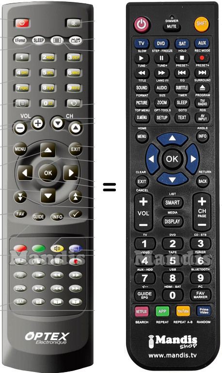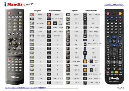 Below, we will show you the correspondence between each button on the original remote control and the button that performs the same function on the replacement remote control. In some cases, you may need to press the SHIFT key before pressing another button to perform certain actions. These additional functions are often not widely used and are included to facilitate understanding of the replacement remote control, or because the original remote control has more buttons than its equivalent.