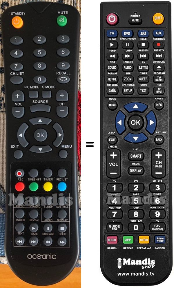 Below, we will show you the correspondence between each button on the original remote control and the button that performs the same function on the replacement remote control. In some cases, you may need to press the SHIFT key before pressing another button to perform certain actions. These additional functions are often not widely used and are included to facilitate understanding of the replacement remote control, or because the original remote control has more buttons than its equivalent.