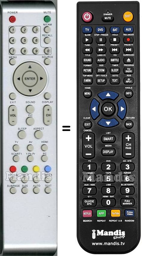 Below, we will show you the correspondence between each button on the original remote control and the button that performs the same function on the replacement remote control. In some cases, you may need to press the SHIFT key before pressing another button to perform certain actions. These additional functions are often not widely used and are included to facilitate understanding of the replacement remote control, or because the original remote control has more buttons than its equivalent.